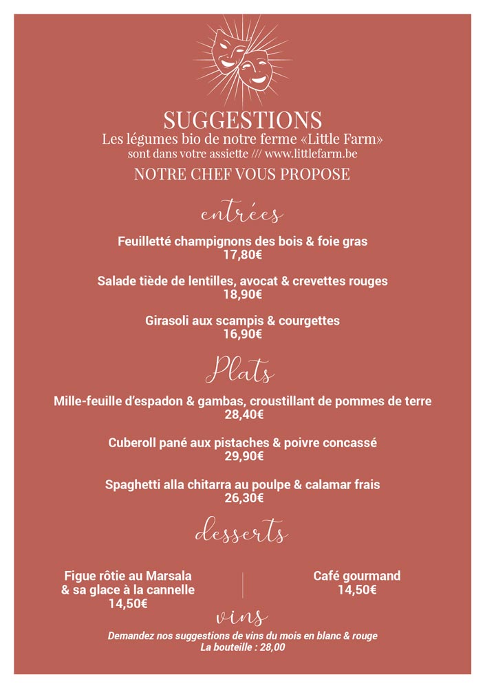 La Pasta Commedia vous propose également des suggestions qui varient de saisons en saisons pour toujours vous proposer des plats gourmands préparés à partir de produits frais et bien évidemment de saison.